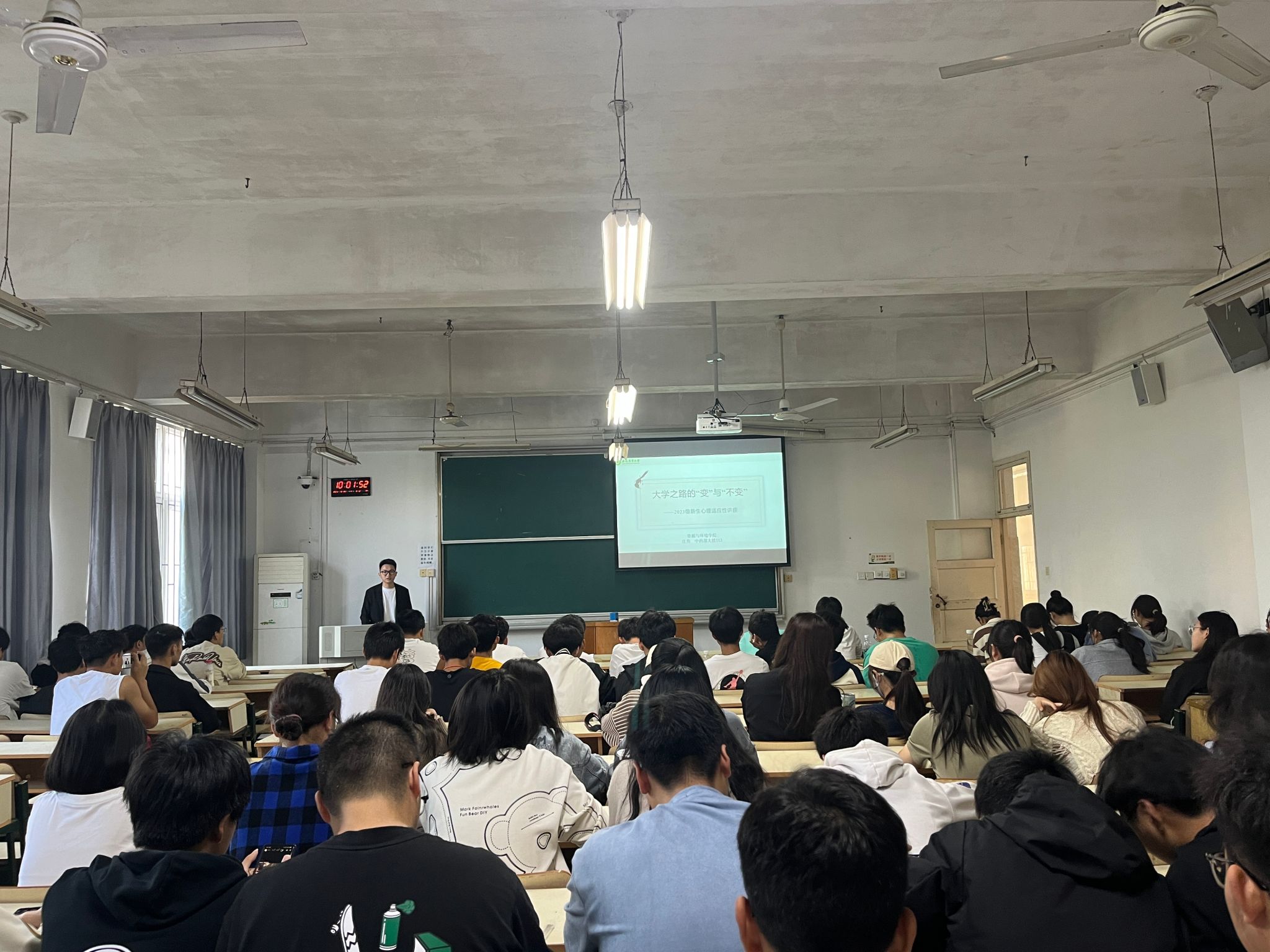本网讯 10月29日,太阳成官网在新生晚自习教室举行主题为“大学之路的‘变’与‘不变’”的2023级新生心理适应性讲座,讲座由学院专职辅导员主讲,2023级全体新生参加。